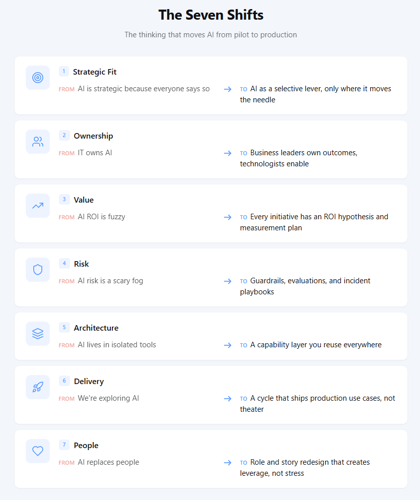 Each shift has consequences. Skip Strategic Fit and you waste money on AI that doesn’t matter. Skip Ownership and demos gather dust. Skip Delivery and you’re stuck in pilot purgatory.