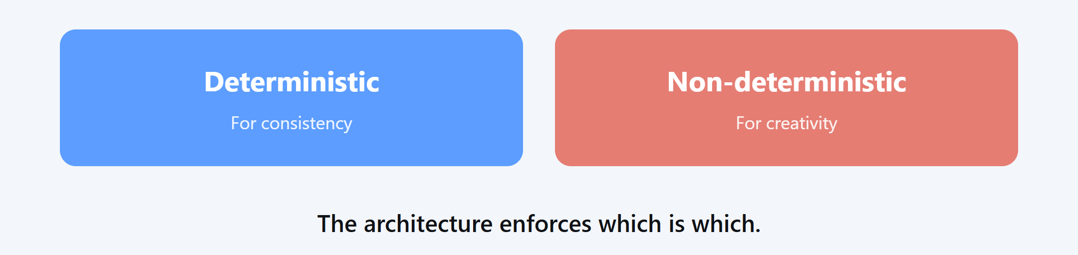 Deterministic for consistency. Non-deterministic for creativity. The architecture enforces which is which.